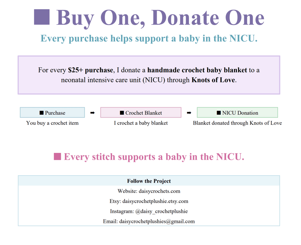 In March, I began a Buy One, Donate One initiative through my crochet market work. For every crochet item purchased, a handmade baby blanket was donated to a neonatal intensive care unit (NICU) through Knots of Love. The goal was to move beyond a typical market exchange and create something that felt more thoughtful and meaningful. Instead of focusing only on sales, I wanted each purchase to contribute to something that could genuinely support families during a difficult time.